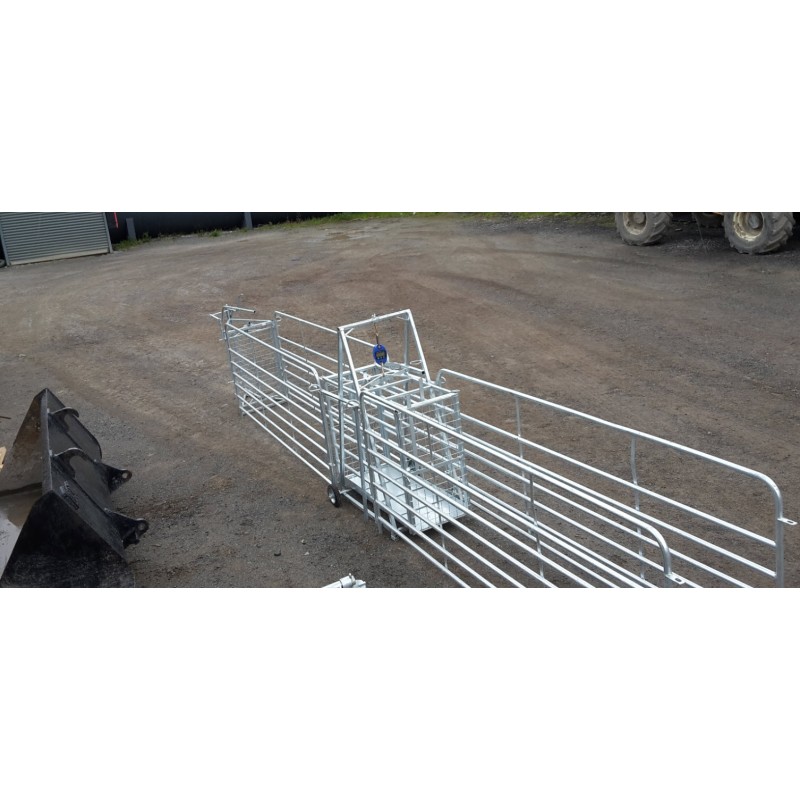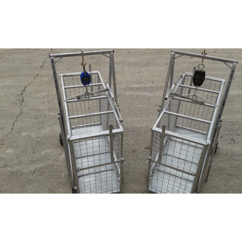 · The frame of the scale has a triangular shape which allows it to take large loads and for greater structural strength. On top of the frame is an adjustable hook-bolt which allows the user to fit any size digital or analog scales to the frame. The frame for the weighing scales has connection links for sheep panels which allow it to be connected to a race system if needed. The scale also has a handle and wheels for easy movement from place to place.